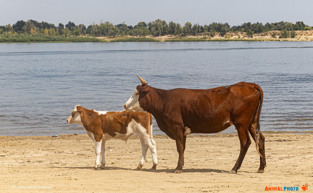 Коровы на пляже в Никольском на Волге.